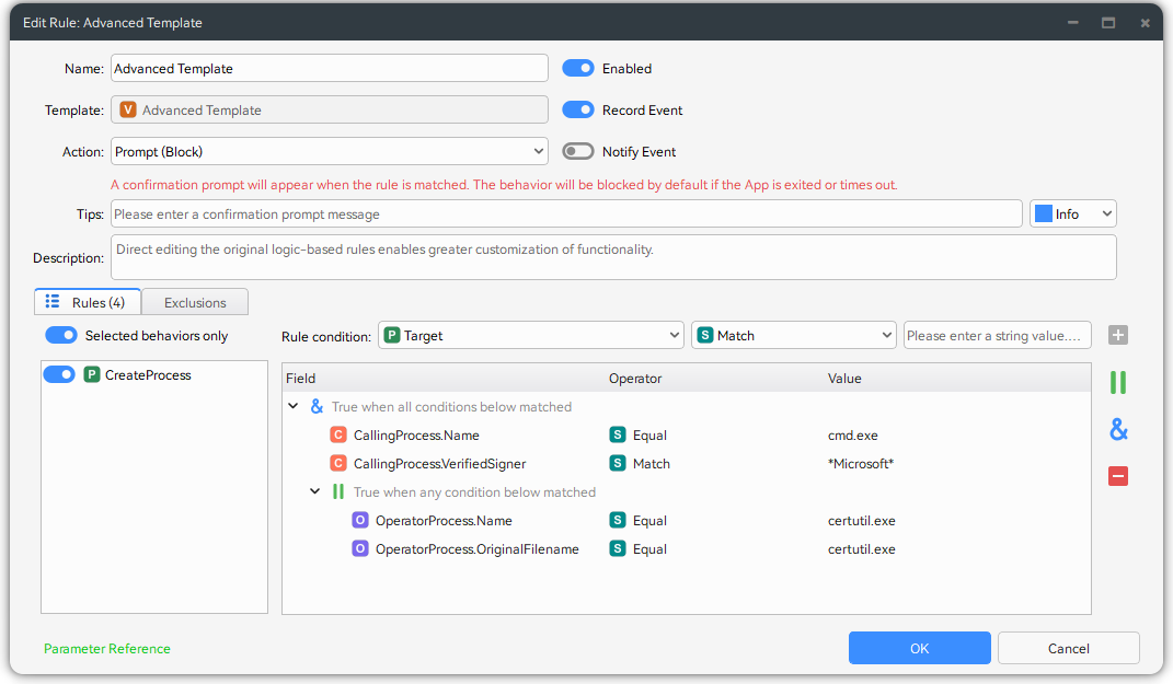 While most rule templates are designed for simplicity and need just a handful of parameters, complex cases demand a more powerful solution. The Advanced Template meets this need by offering full flexibility to combine any conditions and logic.