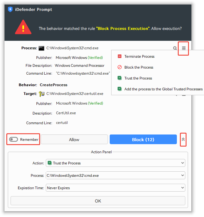 On the prompt dialog interface, both the process and the target have a menu in the upper-right corner, offering the options to Block