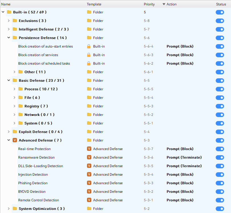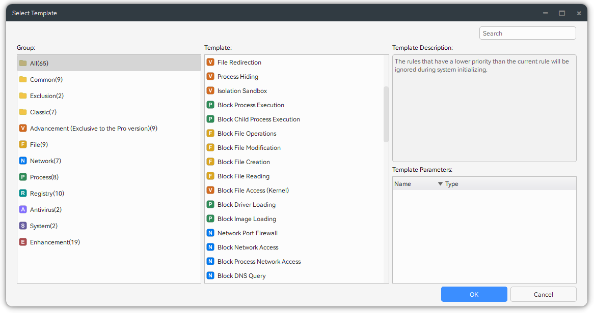 iDefender provides numerous rule templates for quick setup in various situations. It also includes built-in rules, so average users get basic protection immediately without adding any rules themselves. We are constantly improving these rules. If you need protection for a specific case, please let us know.
