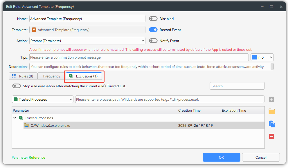 iDefender is different from traditional HIPS and instead uses a template-based rule model. Simply setting a few path parameters can complete the rule editing for a specific case.
