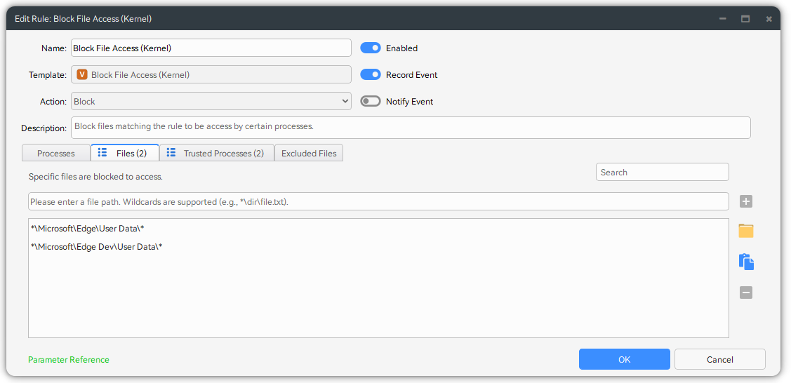 rules to block malicious processes from accessing sensitive files, thereby achieving info-stealing protection.