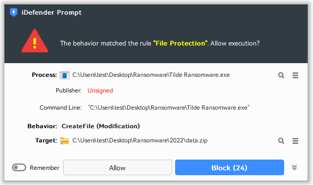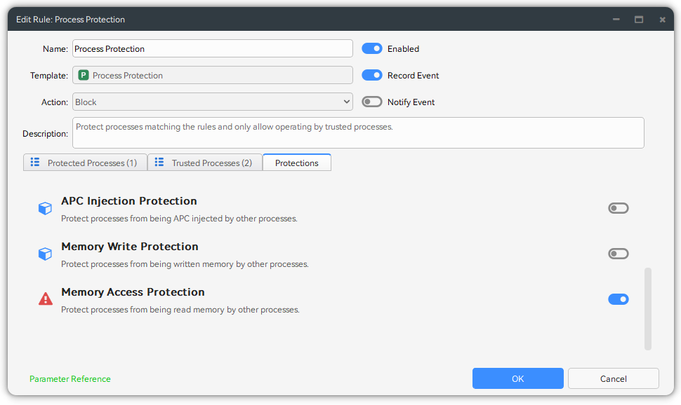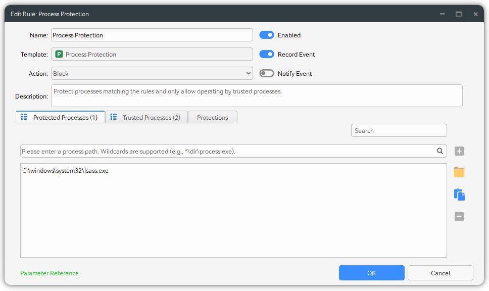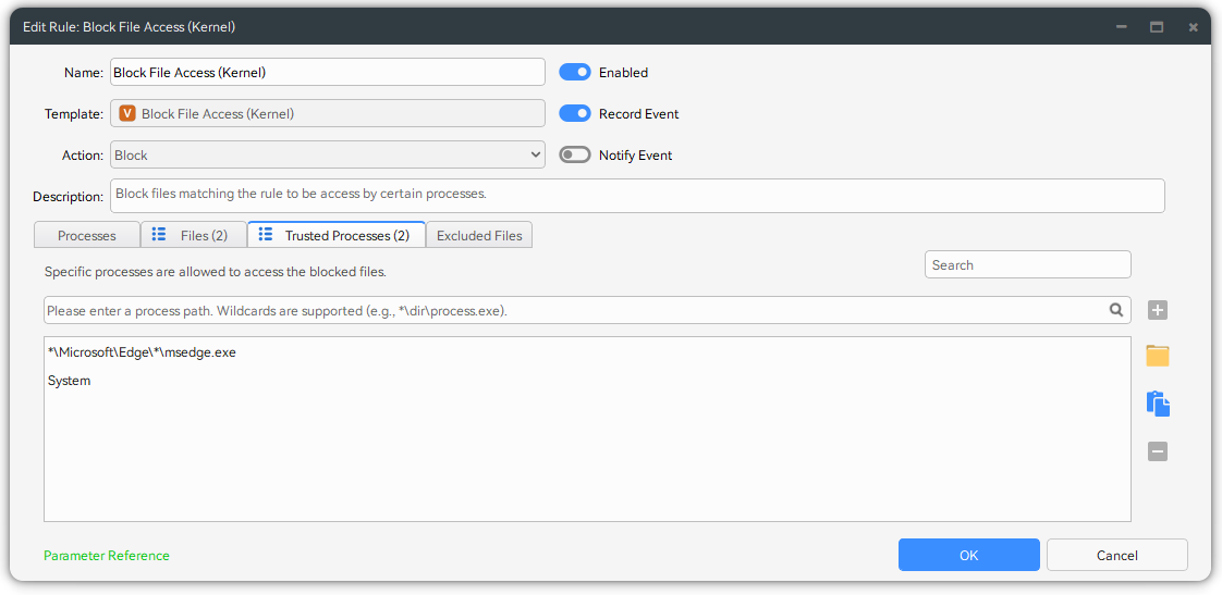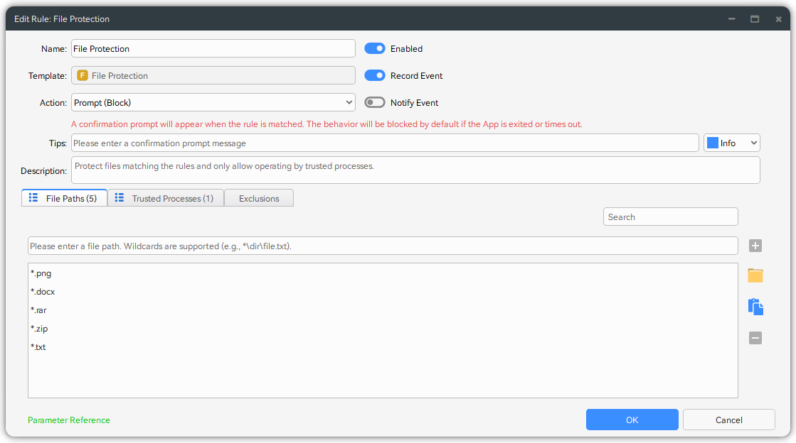 , etc.), and define trusted processes (such as Office applications) allowed to access these files. When an unknown process attempts to modify protected files, the a prompt dialog will appear, allowing you to choose whether to trust or block based on your assessment, and subsequent identical behaviors will not be prompted again. This method can directly prevent unauthorized file tampering.