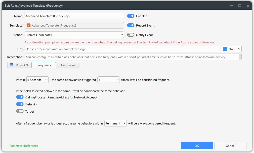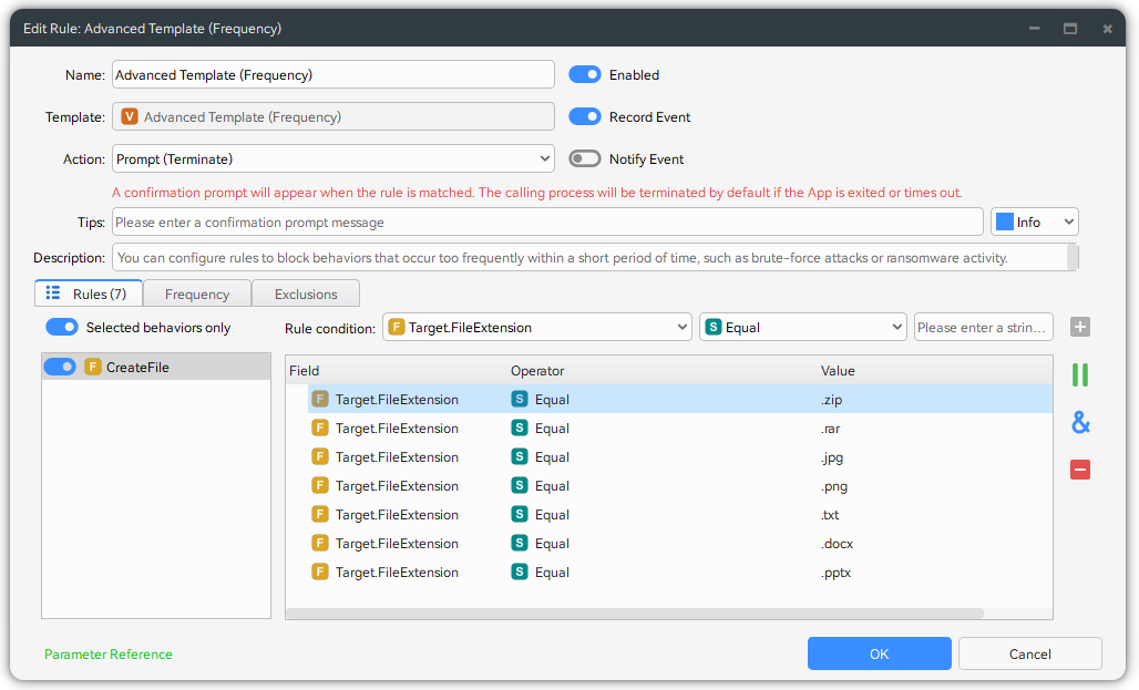 rules, set rules to monitor frequent modifications of multiple files within a short period (e.g., more than 5 files modified within 5 seconds). Such abnormal behavior usually indicates that ransomware is performing batch file encryption, and triggering the rule allows timely attack blocking.