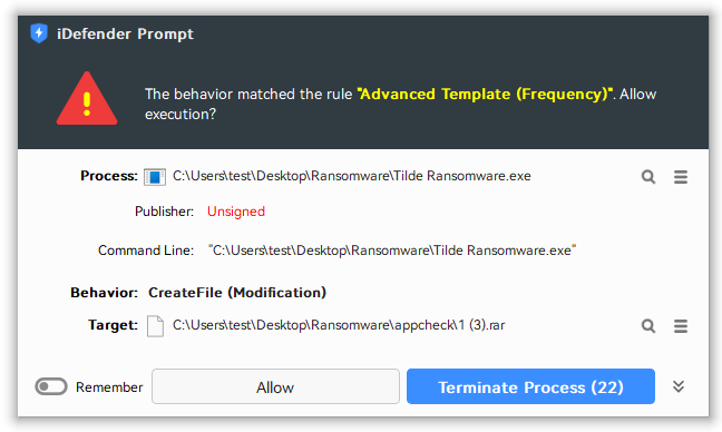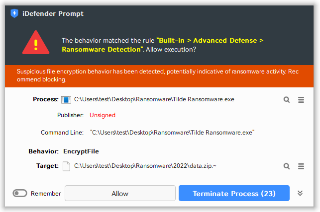 in the build-in rule, by monitoring entropy changes during file encryption and combining this with other typical file manipulation signatures of ransomware, it can effectively identify most known ransomware. However, this method cannot guarantee a 100% detection rate and requires continuous optimization to protect against more viruses.